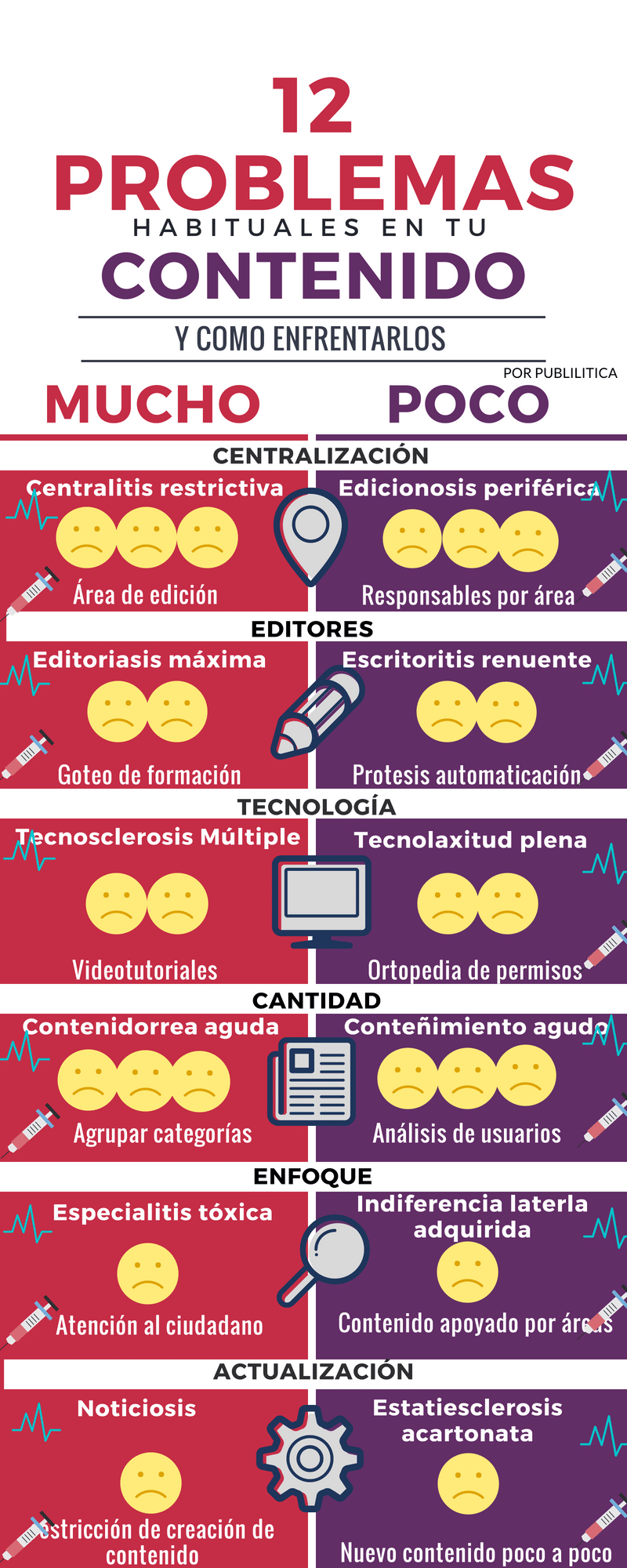 Después de hablar de cómo funciona la creación de contenido en las organizaciones, he pensado que sería útil explicar algunos de los problemas comunes de la materia. Muchos de estos problemas están relacionados entre ellos. Además, suelen ser de resoluciones complejas. De hecho, lo ideal es que miréis el artículo sobre la anatomía del contenido, porque allí veréis las interacciones y causas subyacentes a esos problemas. En cualquier caso, como la vida no es todo resolver grandes problemas y salvar el día es una gran ayuda, aquí os dejo los 12 problemas de contenido más comunes que se encuentran y por dónde tendríais que ver que hacer. No se trata de cambiar la organización, que es algo muy profundo, sino de adaptarse a ese contexto.