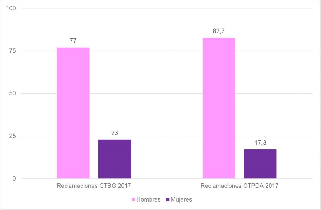El resultado de este análisis sobre las solicitudes se incrementa sobremanera en otro de los ámbitos en los que se puede medir la participación de la mujer en el DAIP. Me refiero a las reclamaciones al órgano de control. A nivel estatal el Consejo de Transparencia y Buen Gobierno (CTBG) en su documento Las reclamaciones en tres años de actividad (2015-2017) muestra de manera clara esta tendencia. Según los datos del CTBG (2017) los hombres reclaman 3 veces más que las mujeres: el 23% de las reclamaciones son presentadas por mujeres frente al 77% que son presentadas hombres (VER NOTAS FINALES). A nivel autonómico, en Andalucía por seguir con los datos ofrecidos anteriormente, el Consejo de Transparencia y Protección de Datos de Andalucía (CTPDA) en su Informe Anual de Actuación 2017, muestra como del total de las reclamaciones presentadas por personas físicas sólo el 17,3% son realizadas por mujeres; los hombres son el 82,7% del total (¡cerca de 5 veces más!). Es decir, las mujeres no sólo solicitan menos información pública sino que además ejercen sensiblemente menos las reclamaciones ante los órganos de control.