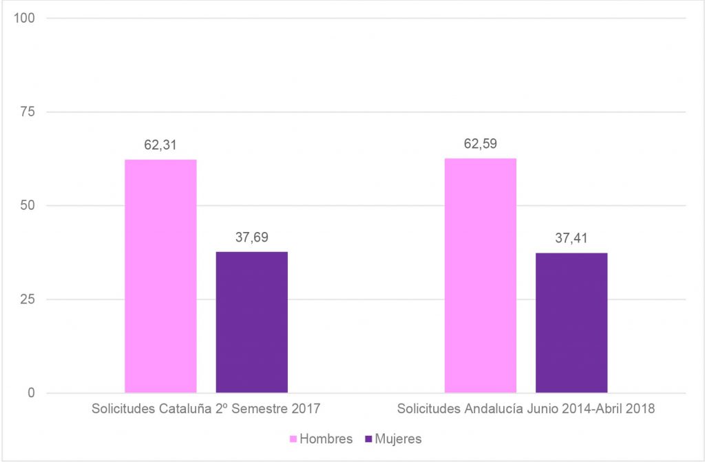 En Cataluña estos datos pueden encontrarse en los Informes de seguimiento y evaluación del derecho de acceso a la información pública, que se publican con carácter semestral. Los documentos revelan las asimetrías existentes entre el número de las solicitudes de derecho de acceso a la información realizadas por hombres y mujeres. Así, en el segundo semestre de 2017, mientras el 62,31% de las solicitudes realizadas por personas físicas son hombres, el porcentaje de mujeres sólo alcanza al 37,69%[3] Se trata de una importante diferencia de casi 25 puntos porcentuales. En Andalucía esos datos se repiten de forma calcada. Según la respuesta obtenida a una solicitud de DAIP realizada, desde la fecha de puesta en marcha del Portal de Transparencia de la Junta de Andalucía (junio 2014) hasta el pasado mes de abril de 2018 las mujeres sólo presentaron el 37,41% del total de las solicitudes recibidas por la Administración Andaluza frente al 62,59% que realizaron los hombres.
