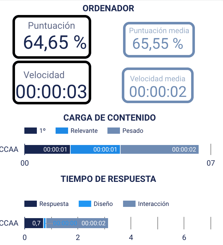 Aquí hay que decir que los tiempos de carga de las CCAA son bastante peores que los de la AGE (llegando hasta 25 segundos de la carga más pesada), si bien los tiempos para interactuar y, especialmente de respuesta es bastante mejor en el caso autonómico. Es decir, aparentemente, hay mejor arquitectura pero el diseño no parece especialmente optimizado.