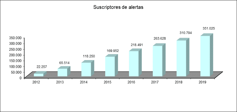 Desde su puesta en explotación, el número de suscripciones al servicio de alertas no ha dejado de crecer cada año, siendo a 31 de diciembre de 2019 de 351.025, un 12,94% más que a final de 2018.