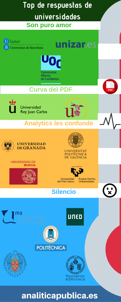 - la Universidad de Murcia me ha sacado el listado de páginas vistas por mes en vez del número y sin datos de uso.Universidad de Granada no parece encontrar el número de usuarios en su herramienta de analítica.La Universidad del País Vasco, que al principio rechazó responder porque las webs de transparencia no estaban acotadas, ha respondido tras la resolución de la comisión vasca. Como resultado han decidido crear un subdominio para poder contabilizar este tráfico, lo que es genial. El principal problema está ahora en que me ha pasado los datos en PDF, así que toca un trabajo casi amanuense.