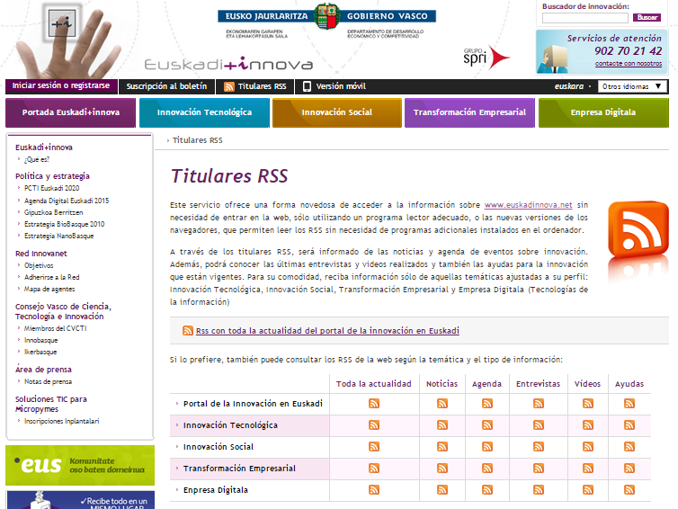 Sus titulares RSS destacan por su parrilla de contenidos, que facilita la suscripción según temáticas y tipos de información.