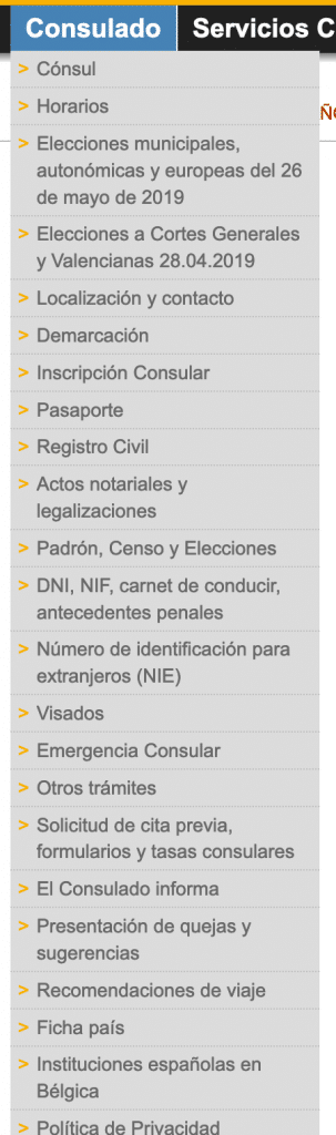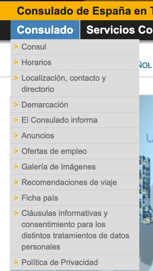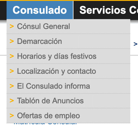 Pues bien, como decíamos las páginas consulares parecen tener un CMS común del Ministerio de Exteriores con una plantilla específica, un menu con 4 bloques principales en dos niveles y a partir de ahí, una cierta flexibilidad.